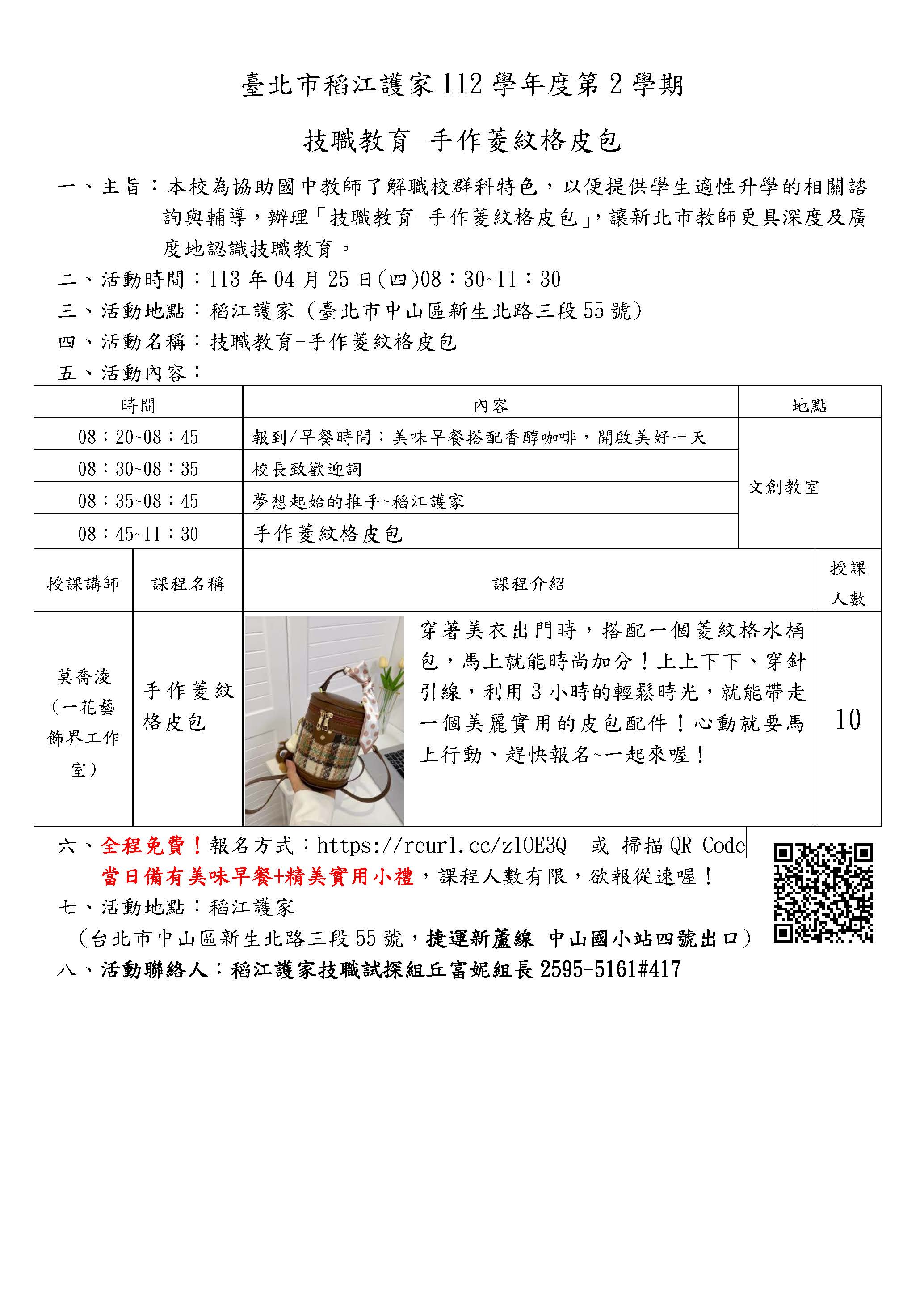 二、臺北市稻江護家於113年4月25日(四)上午8:30-11:30,辦理「技職教育-手作菱紋格皮包」。誠摯邀請 貴校教師及輔導學生升學相關行政人員踴躍報名參加,全程免費。