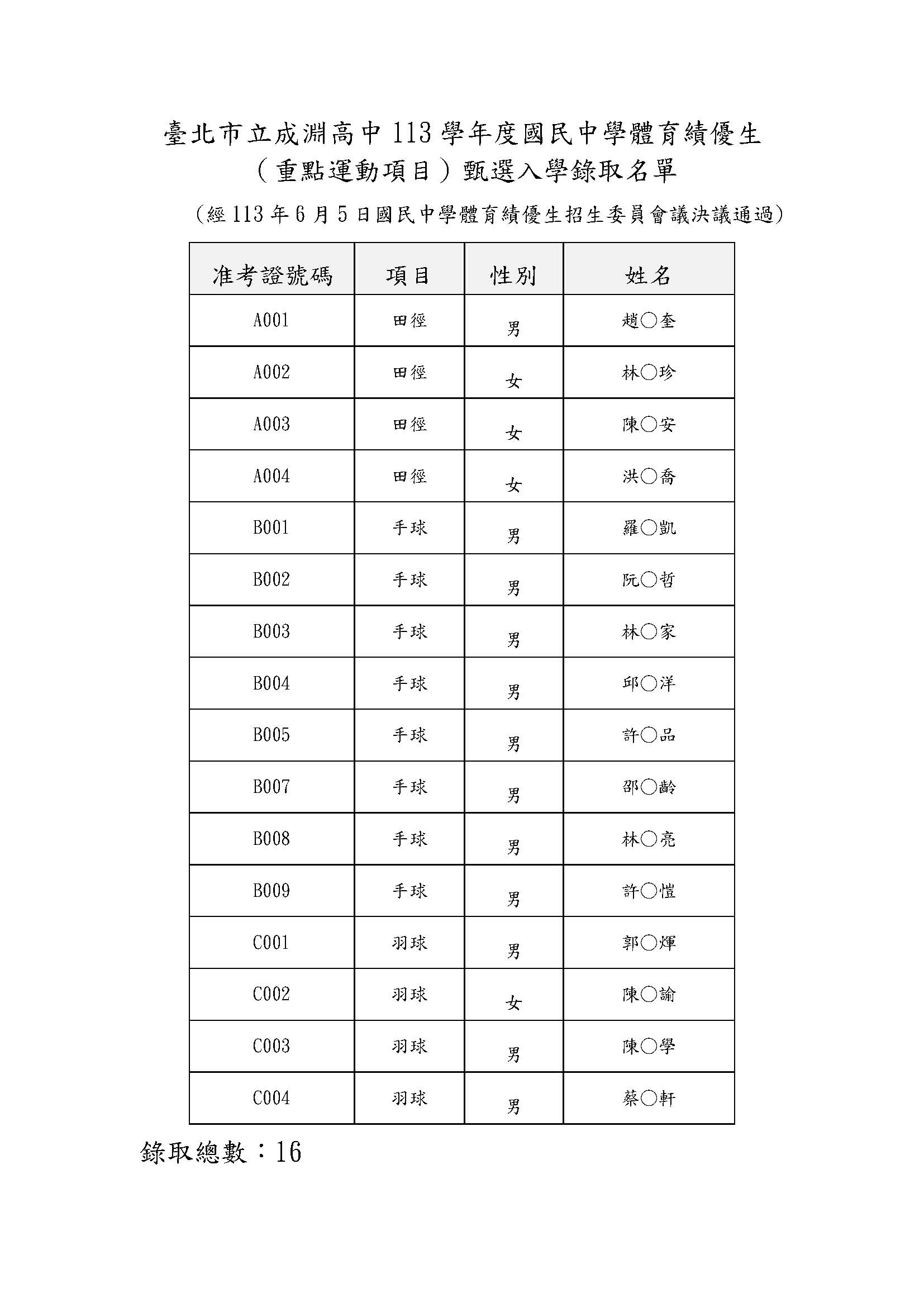 3. 以下為錄取名單:
