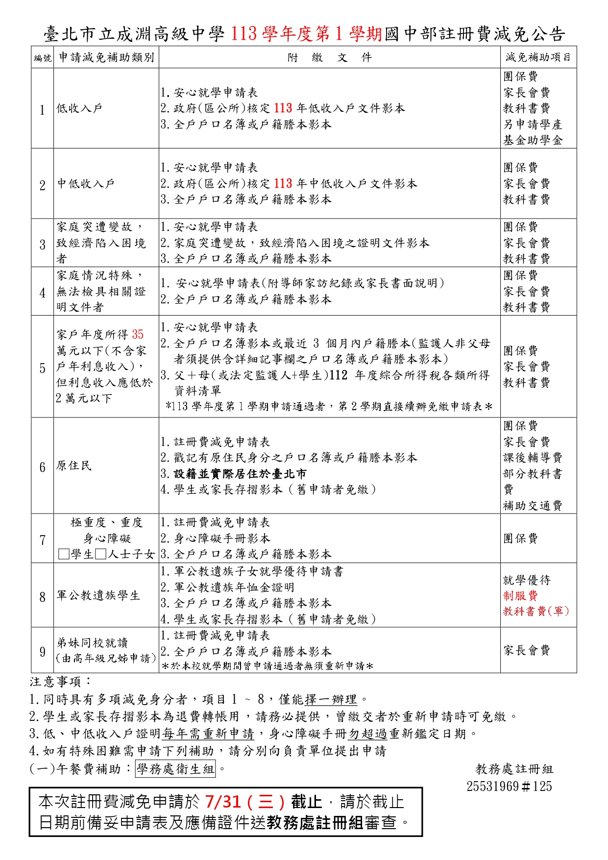 三、有關【修正】113年度第1學期【安心就學申請表】及【註冊費減免申請表】如附件,請有需要申請之學生家長自行列印申請表或於申請期限【7/31日前】至教務處註冊組獎學金申請處領取表格。