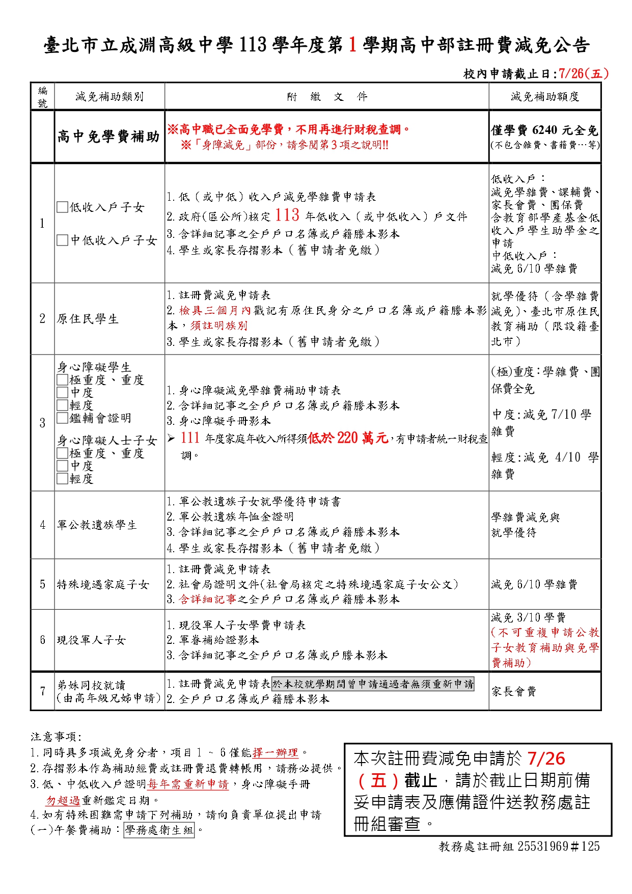 113學年度第1學期【高中部減免學雜費】,欲申請者請備妥申請表「如附件」及應備證明文件,於【7/26(五)中午前】繳交至教務處註冊組獎學金申請處,各項補助皆有辦理時程,逾期繳交恐無法申請,為避免影響您的自身權益務必準時繳交!感謝配合。