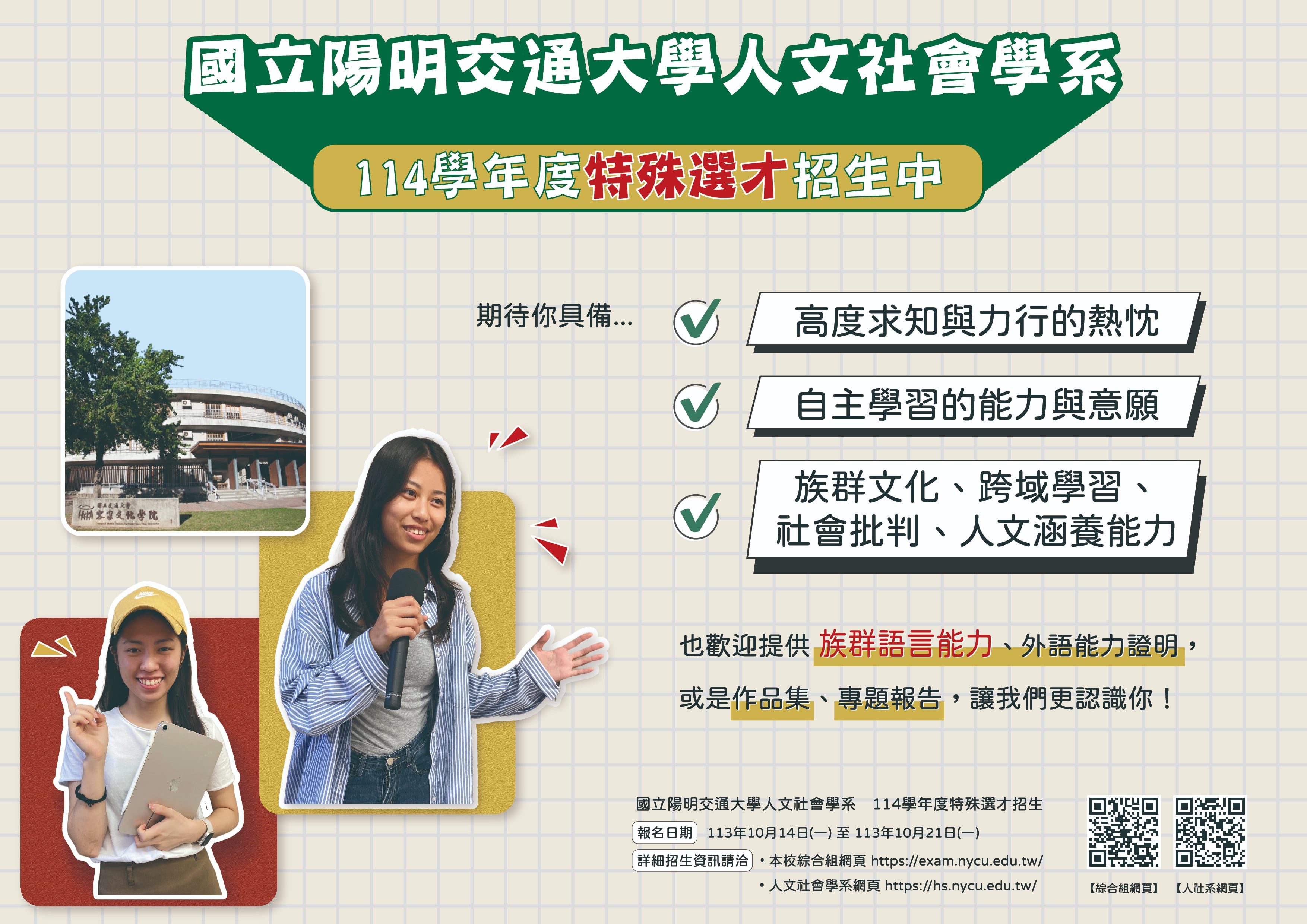 一、本校人文社會學系擬招收具備高度求知與實踐的熱忱、自主學習的能力與意願,並具備「族群文化」、「跨域學習」、「社會批判」、「人文涵養」能力之學生。