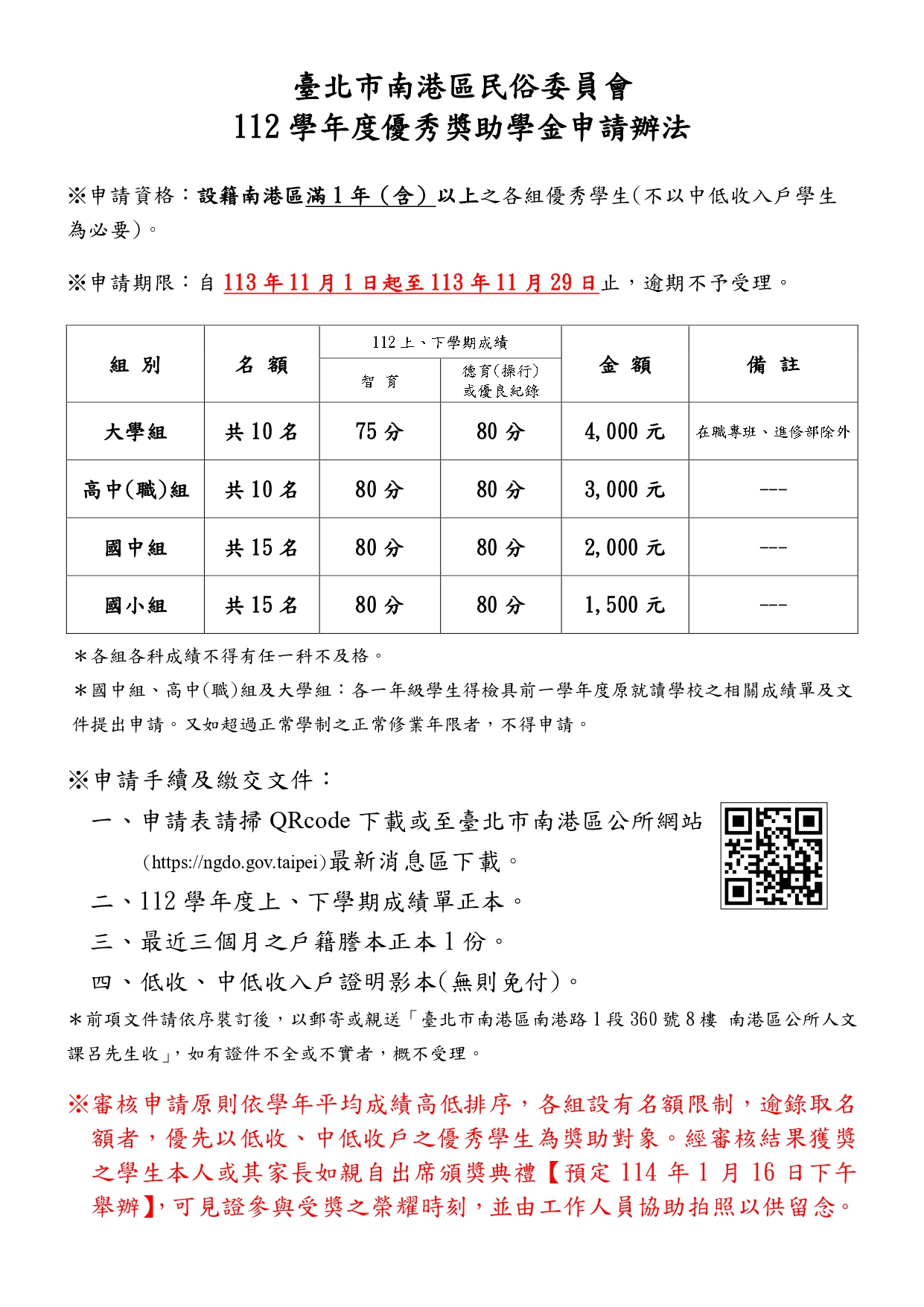 【對旨揭獎學金有申請意願之學生,請自行於11/29日前向該區公所申請】