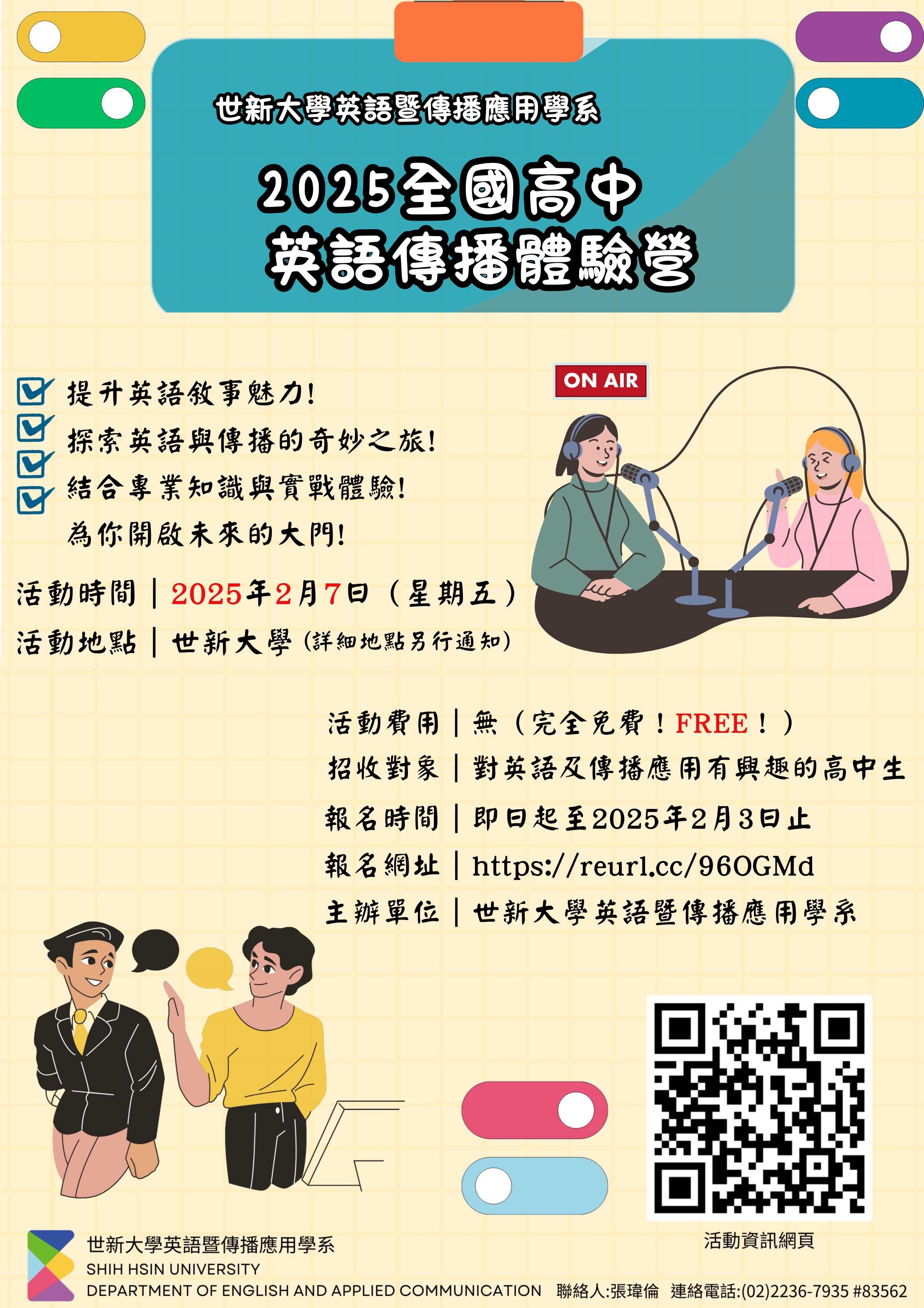 (一)活動名稱:世新大學英語暨傳播應用學系2025全國高中英語傳播體驗營