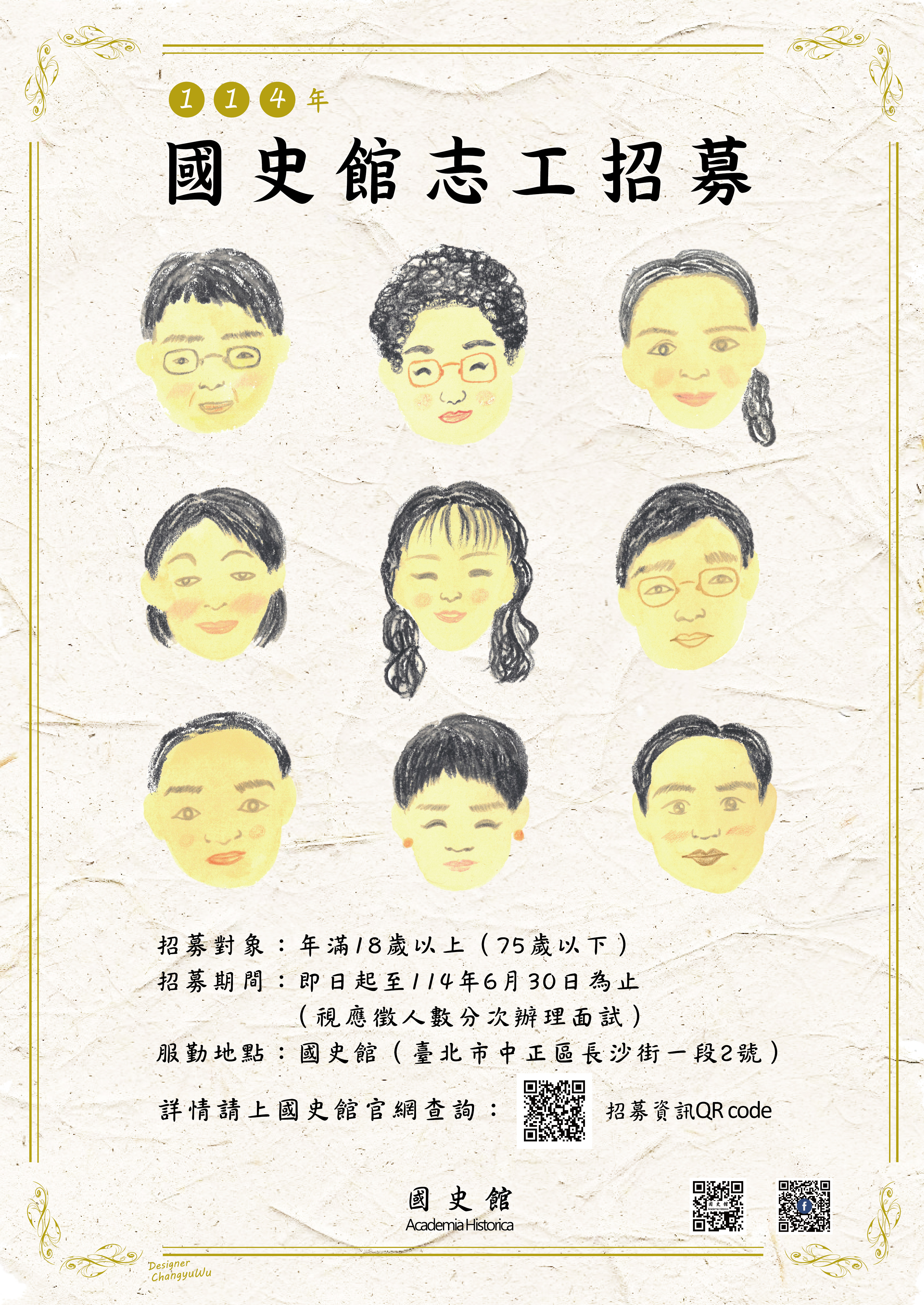 一、為結合社會人力資源,協助推廣總統副總統文物及館藏檔 案、史料,培養愛好歷史、文化、藝術且具服務熱忱之導 覽服務人員,114年度本館預計招募一般志工、外語專案志 工及史學專案志工(臺灣史、政治史等)各5名。