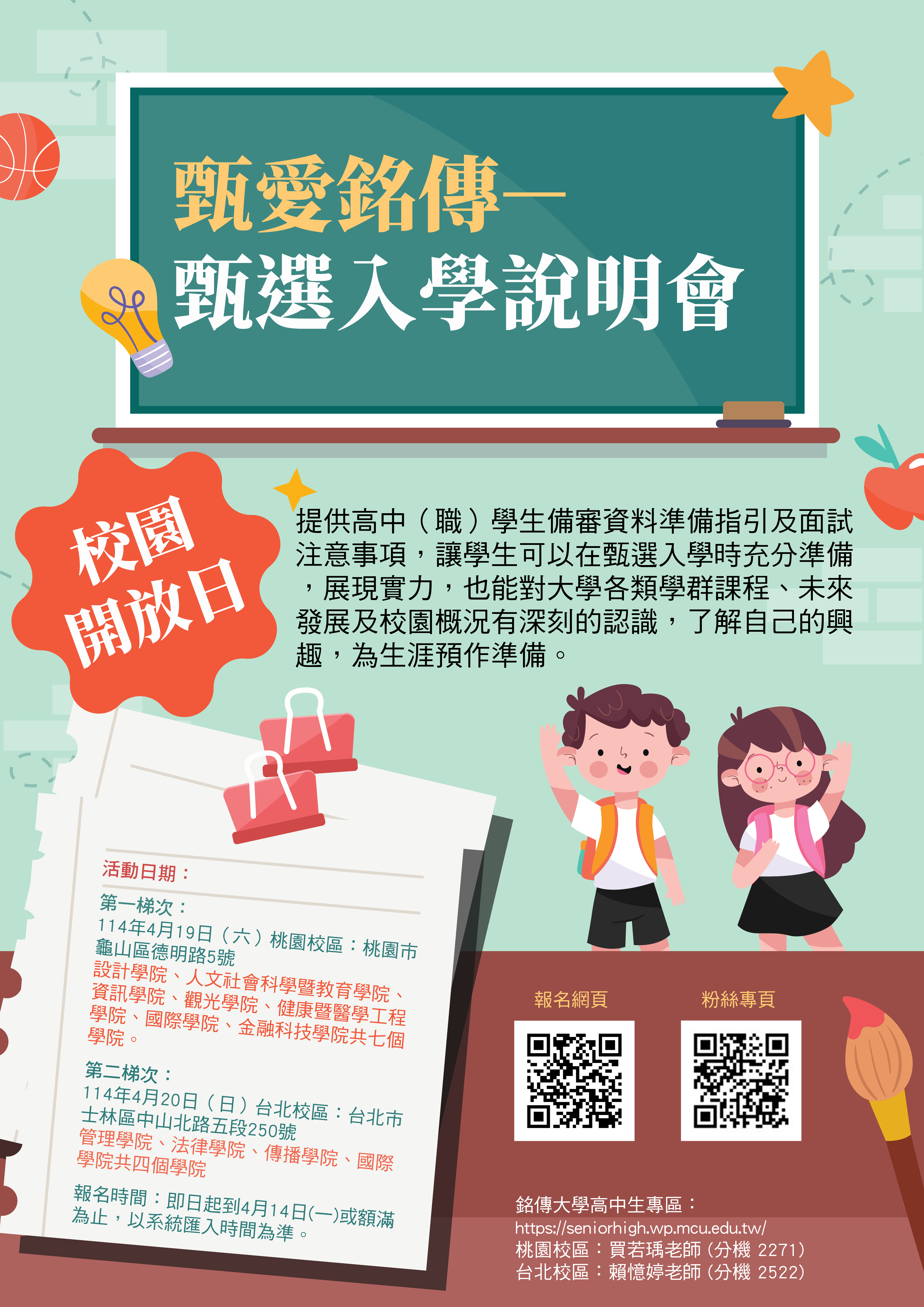 一、銘傳大學為能讓高中生了解自己的興趣,為生涯規劃預作準備,並提供學生備審資料準備指引、學習歷程檔案諮詢及面試注意事項,將於4/19(週六)桃園校區及4/20(週日)台北校區辦理「甄愛銘傳-甄選入學說明會」校園開放日,費用全免。