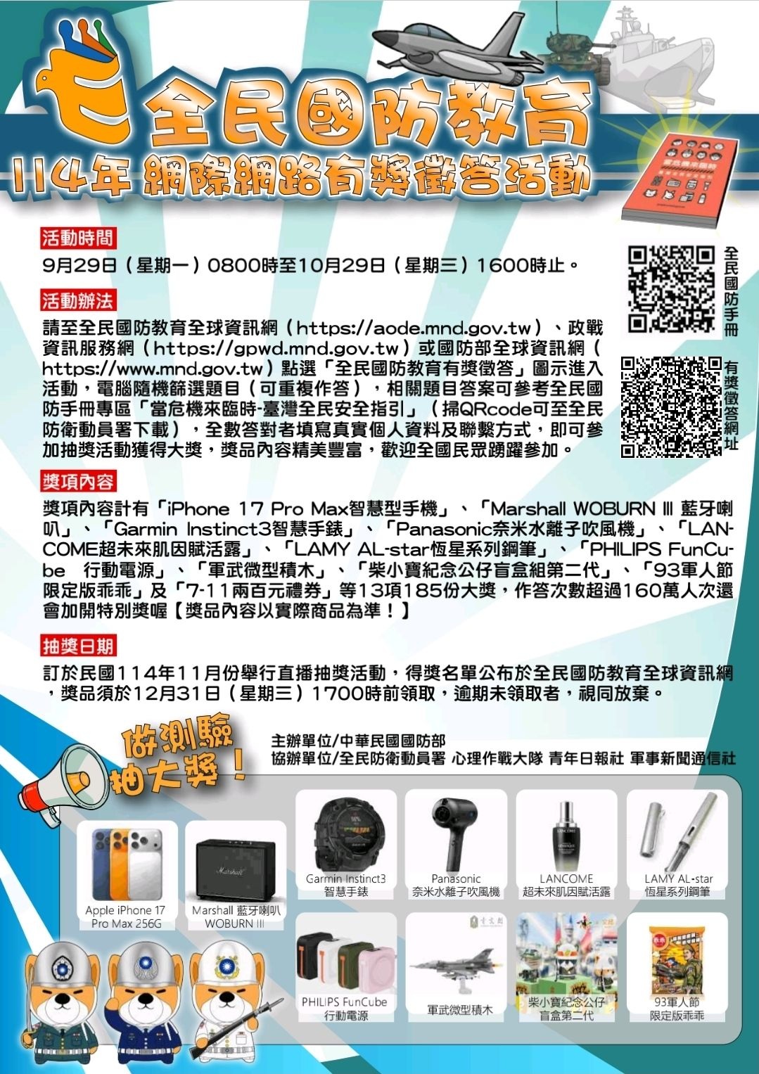 四、活動獎項:獎項內容計有 iPhone17 Pro Max 256G智慧型手機、Marshall Woburn III三代藍芽喇叭、GARMIN Instinct3-50mm,AMOLED,戰術版智慧腕錶等多項好禮:訂於114年11月份辦理公開抽獎活動,獲獎名單將公告於「全民國防教育全球資訊網」,多項好禮等你來帶回家!~~~