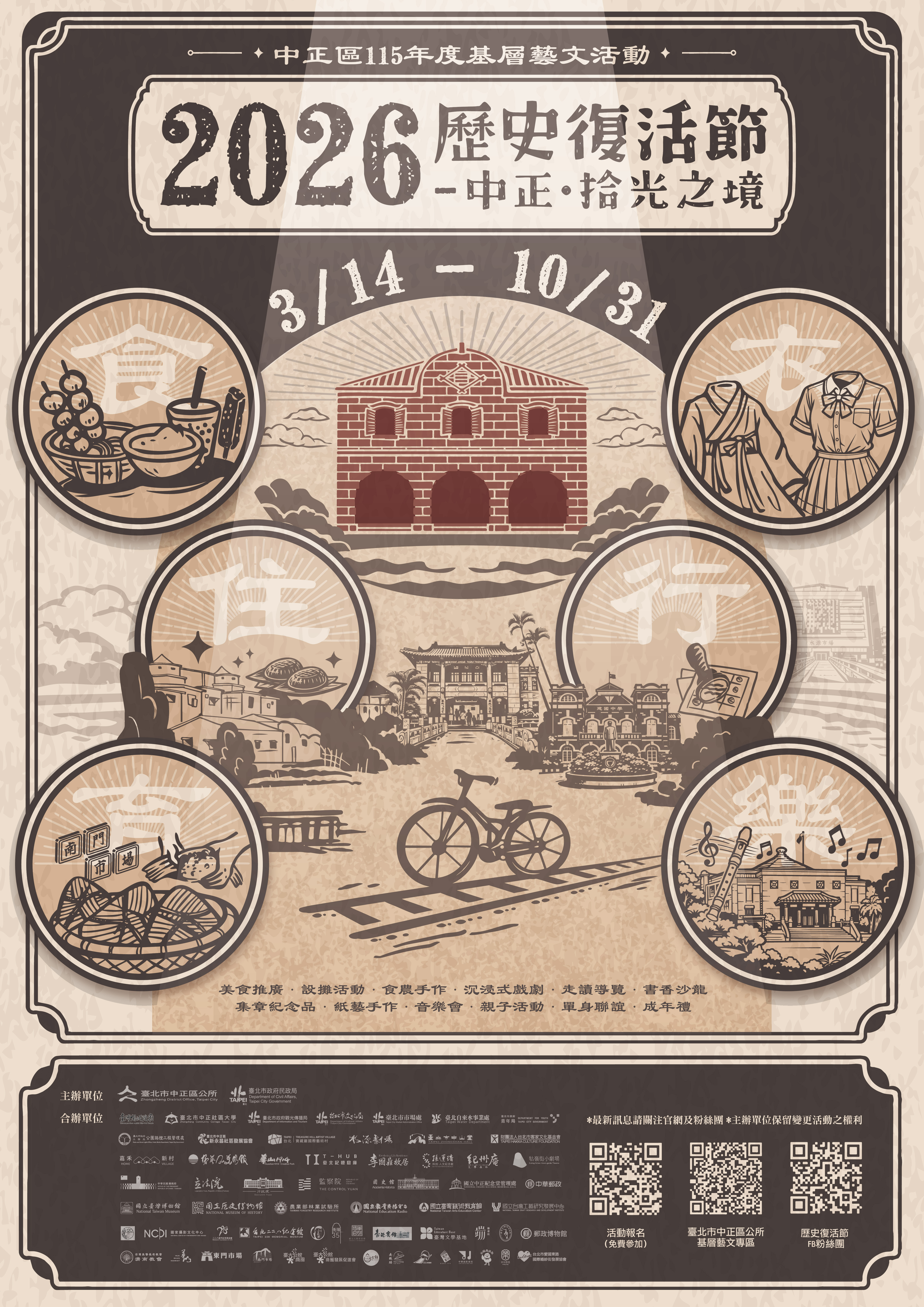 「2026歷史復活節~中正.拾光之境」系列藝文 活動,於115年3月14日至10月31日登場!豐富精采的系 列活動,邀您一起在中正拾起美好時光,品味獨特的中 正區地方文化!詳情請上臺北市中正區公所網站基層藝 文專區(https://reurl.cc/xpmNqe)或歷史復活節FB粉 絲團(https://www.facebook.com/papagozhongzheng)查 詢,