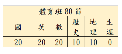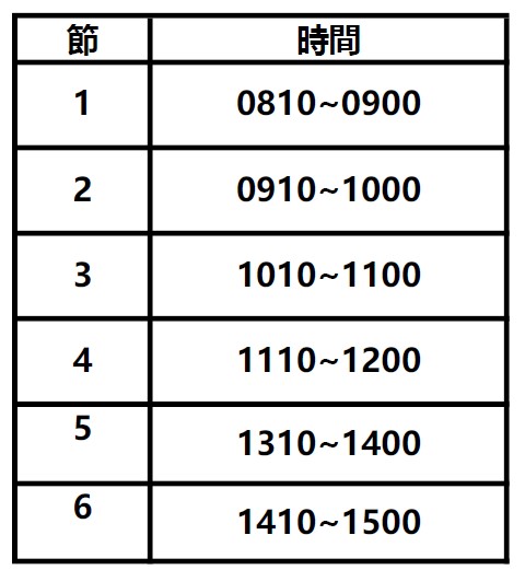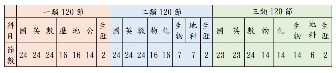 每週上課五日,301-311每日排課6節,4週計120節。312每日排課4節,4週計80節。