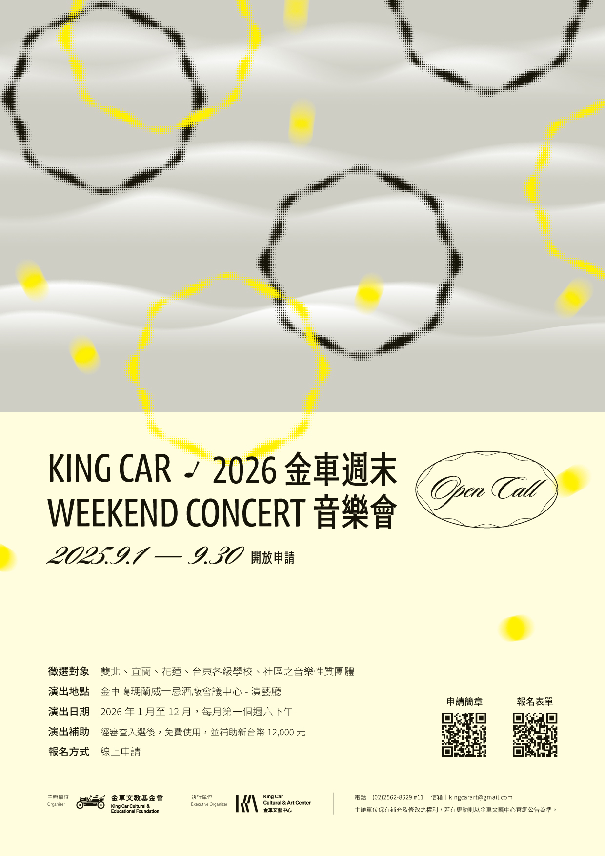 (七)申請方式:線上申請,詳情請上金車文藝中心官網/競賽 與徵件頁面查詢 (https://www.kingcarart.org.tw /projects-detail/180)
