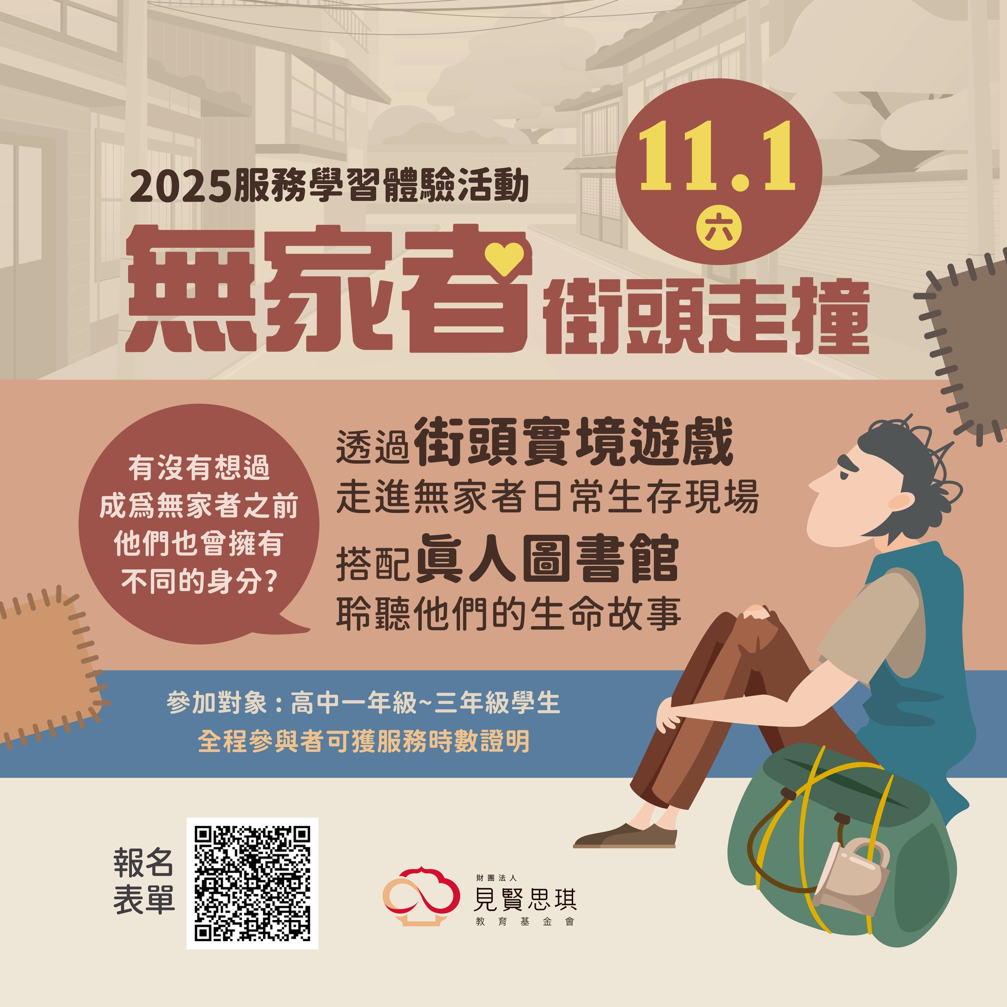 一、本會辦理「2025服務學習-無家者街頭走撞」服務學習活 動,透過做中學提供社會參與機會,增進青少年對公共議 題的關心,豐富其學習視野,歡迎青少年踴躍參與。